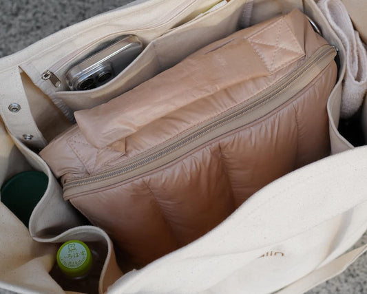 おむつに限らずお財布やポーチ、おやつなどサクッと持ち運びできるサイズ感、そしてCalinならではの”子育てグッズには見えない”パパ・ママのコーディネートに溶け込むデザインとなっております。